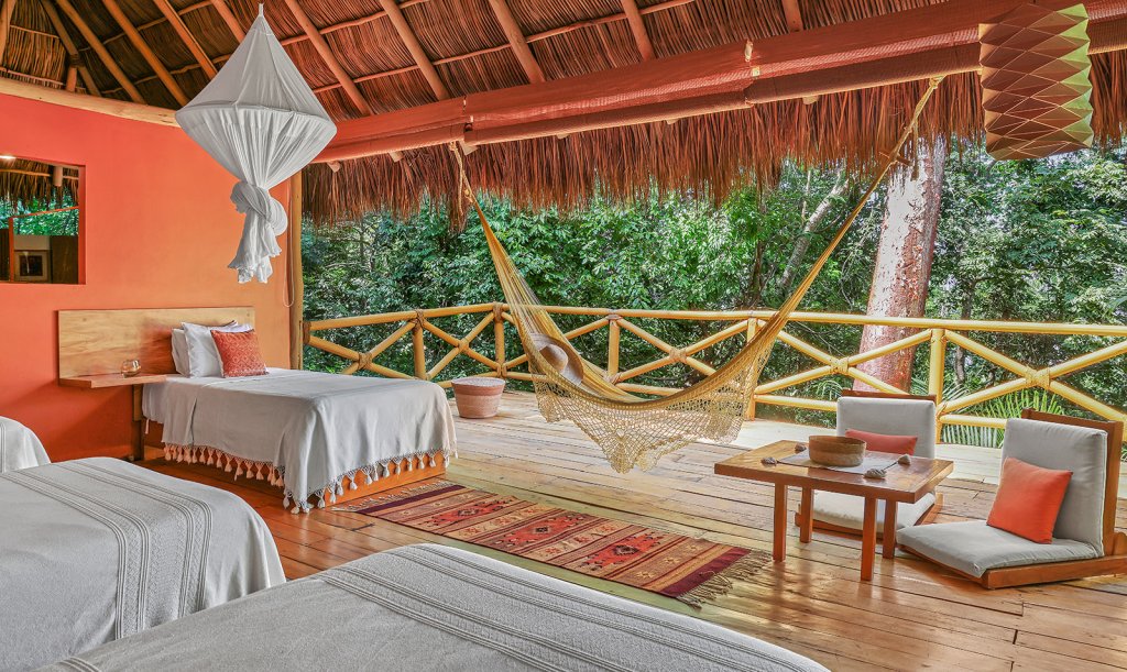 The “Eco Chic” Category of rooms comes in a multiple of options. “Open Air” options include a full hammock, and either a King bed, or two Full beds. The air conditioned or “A/C” option has glass sliding doors and a smaller chair hammock, also in King or two Full beds.